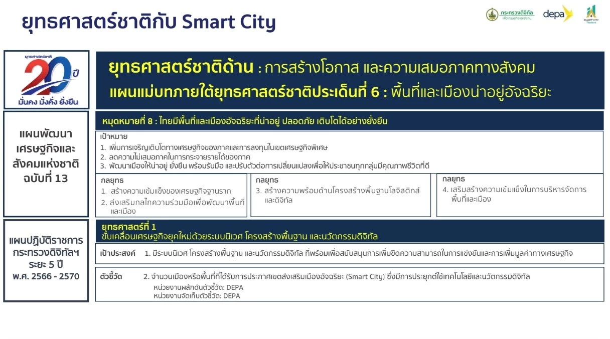 กระทรวงดิจิทัลฯ โดย ดีป้า ดำเนินการส่งเสริมและสนับสนุนการพัฒนาเมืองอัจฉริยะในระดับท้องถิ่นอย่างต่อเนื่อง เพื่อให้สอดคล้องกับแผนพัฒนาเศรษฐกิจและสังคมแห่งชาติ ฉบับที่ 13 หมุดหมายที่ 8 ไทยมีพื้นที่และเมืองอัจฉริยะที่น่าอยู่ ปลอดภัย เติบโตได้อย่างยั่งยืน