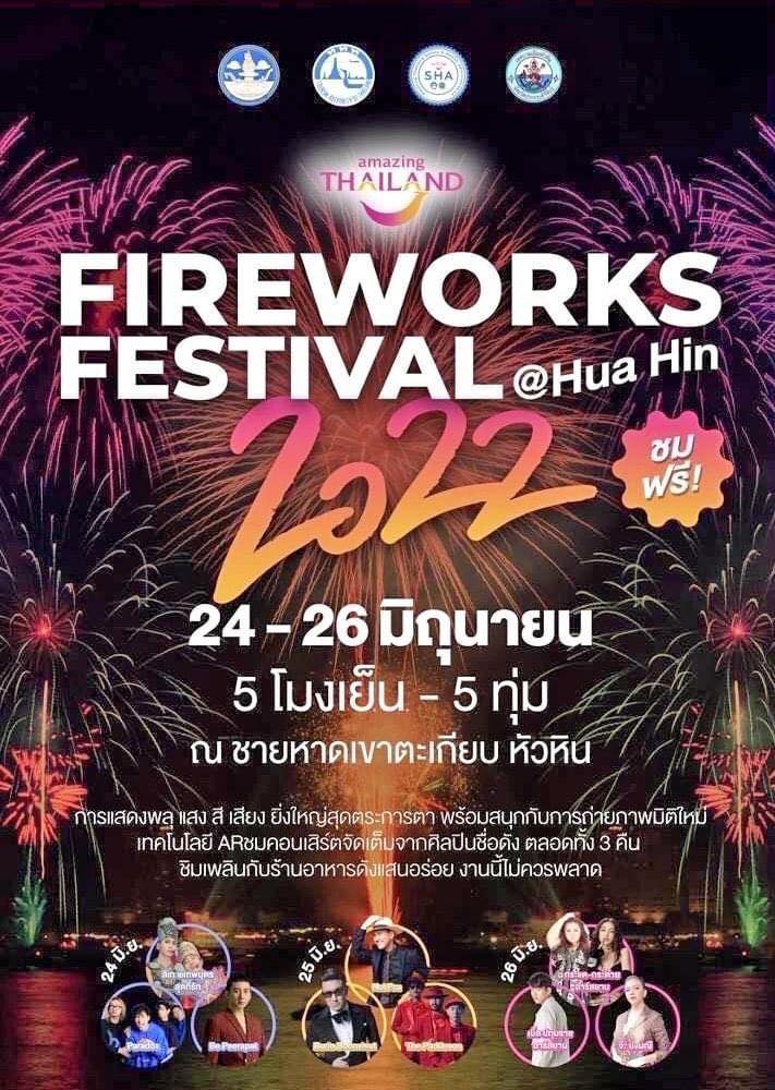 เทศกาล Amazing Thailand Firework Festival 2022 @Hua Hin จะมีจนถึงวันที่ 26มิ.ย.นี้ บริเวณหาดหัวดอน เขาตะเกียบ อ.หัวหิน จ.ประจวบคีรีขันธ์ บรรยากาศถือว่าคึกคักมาก ภายในงานมีทั้งการแสดงพลุประกอบแสง สี เสียง สุดตระการตา กว่า 1,777 นัด วันละ 2 รอบ แต่ละชุดมีความสวยงามและน่าสนใจไม่ซ้ำกัน พร้อมคอนเสิร์ตจากกองทัพศิลปินมากมาย