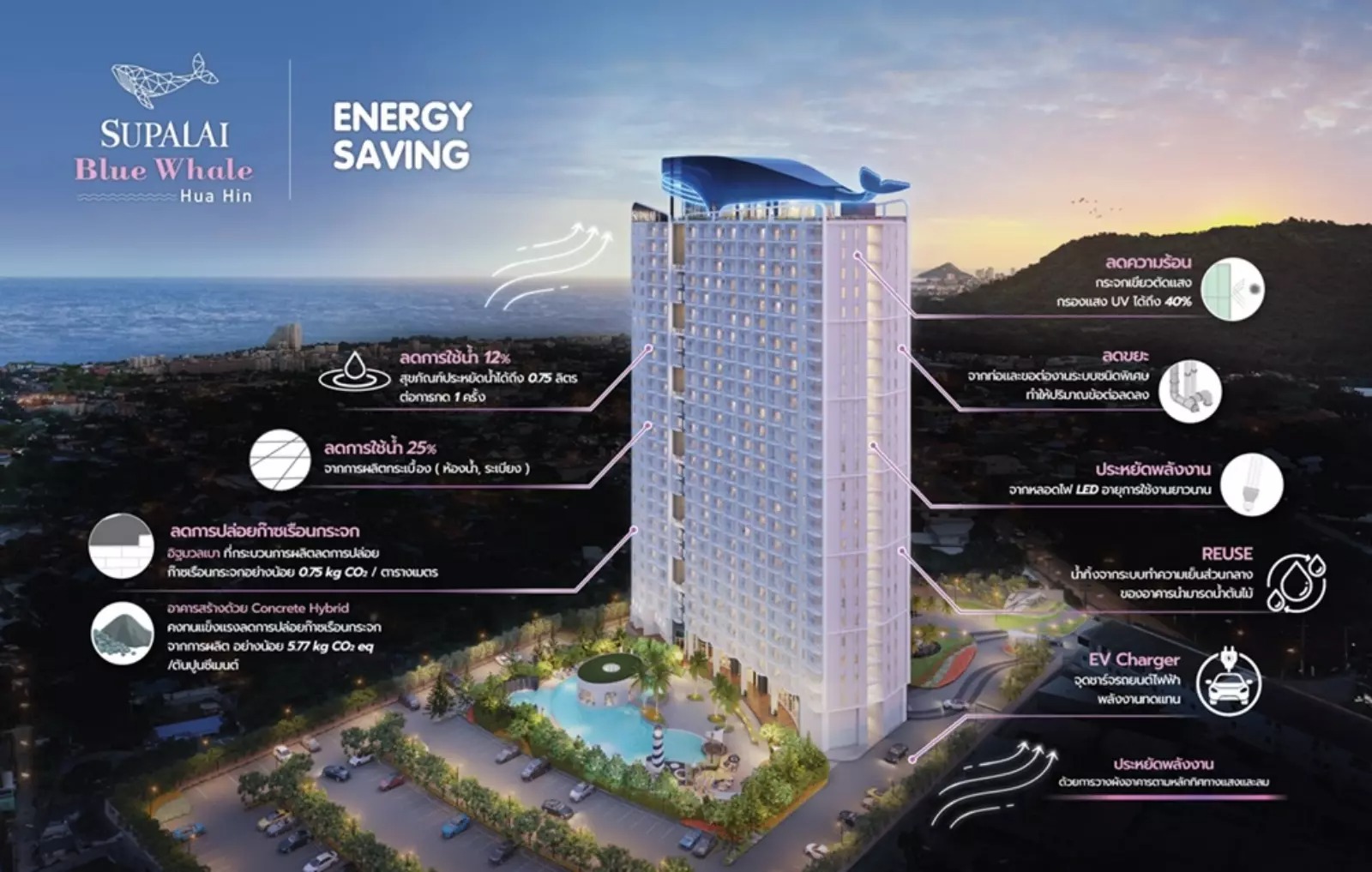 SUPALAI Blue Whale หัวหิน คอนโดมิเนียม High Rise สูง 28 ชั้น เป็นโครงการตากอากาศในทำเลหัวหิน โครงการแรกของศุภาลัย ที่ได้แรงบันดาลใจมาจาก สีสันแห่งท้องทะเล และมี Highlight อย่างเจ้า “วาฬสีน้ำเงิน” โดดเด่นไม่เหมือนใครเพราะมีวาฬอยู่ด้านบนชั้นดาดฟ้า ให้มองเห็นมาแต่ไกล